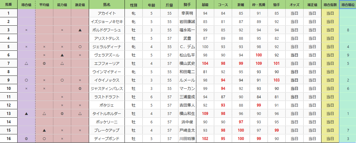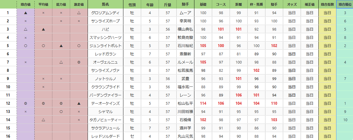 チャンピオンズカップ(GI) 総合指数表(前々日)