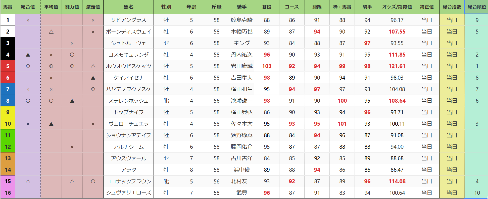 当日のオッズなどからの補正値がなく、正確な指数ではありませんが、